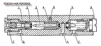 При подаче питания на электродвигатель станции шестерённый насос подает масло из бака во входной канал «А» клапанной коробки. Под действием давления масла поршень 4 вместе с клапаном 3 перемещается, сжимая пружину 2, при этом сливной канал «Б» закрывается разгрузочным клапаном 3. Затем поршень 4, перемещаясь дальше по клапану, открывает проход масла к выходному каналу «В». При достижении давления настройки предохранительного клапана 5 масло через него сливается обратно в бак через канал «Г». После отключения электродвигателя и насоса поршень с клапаном под действием пружины возвращается в исходное положение, при этом входной канал перекрывается, а выходной канал соединяется со сливным через подпорный клапан 1.