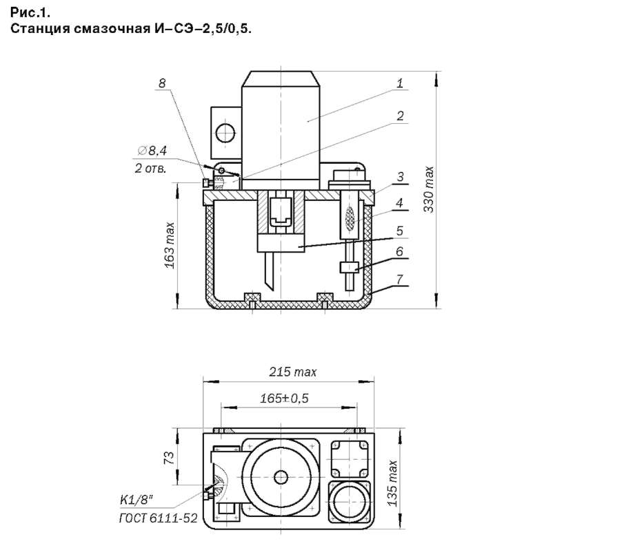 Станции смазочные И-СЭ состоят из бака (поз.7) (для И-СЭ 2,5/0,5 он выполнен из прозрачной пластмассы вместимостью 2,5 дм3; для И-СЭ 10/0,5 и 10/1,0–металлический с маслоуказателями верхнего и нижнего уровней вместимостью 10 дм3 ), закрытого крышкой (поз.3), к которой крепится насосная установка в виде шестеренного насоса (поз.5) с электродвигателем (поз.1), клапанная коробка (поз.2) с дросселем (поз.8) выпуска воздуха, реле уровня (поз.6) и заливной фильтр (поз.4) с воздушным фильтром. Места для крепления станций расположены на крышке.