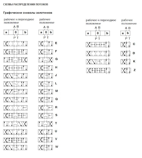 | порт Р, А, В | порт Т | порт Y | пост.ток (G, DC) | переменный ток (W, AC) | DC | AC | 2 э/магн. | 1 э/магн. | |||||