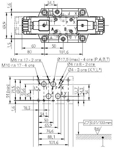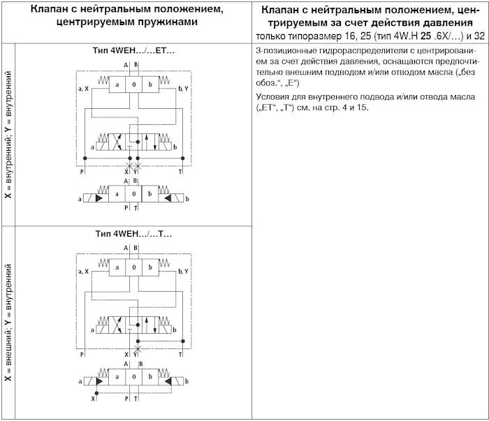 3. тип 4WEH16../ ЕТ..-подвод масла внутри из канала Р главного клапана, отвод масла внутри по каналу Т в гидробак (на присоединительной плите закрывают порт Х и порт Y);