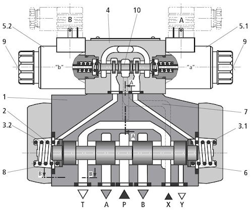 Соответственно при воздействии на электромагнит «b» золотник пилота управления (10) смещается вправо и т.д.., в этом случае в главном клапане (1) происходит соединение каналов Р c каналом А и канала В с каналом T.