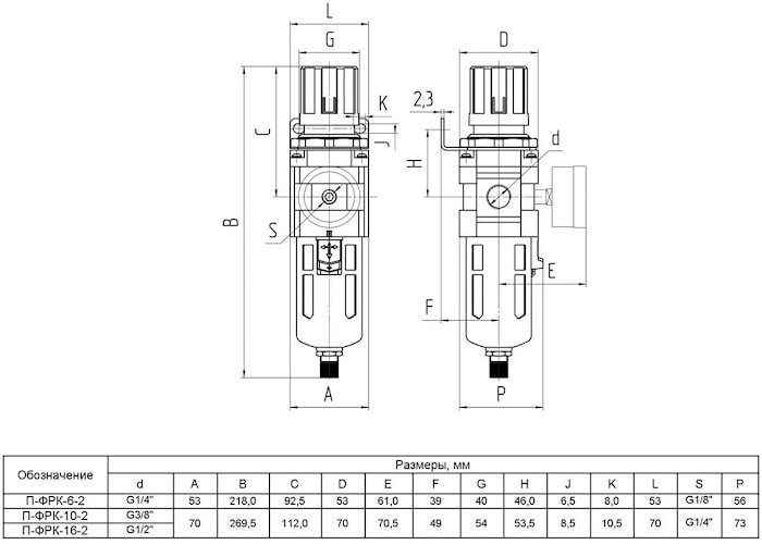 Габаритные и присоединительные размеры блоков подготовки воздуха типа П-ФРК-..: