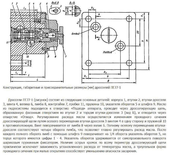 Принцип работы и присоединительные размеры дросселей ПГ77-12 и ПГ77-14: