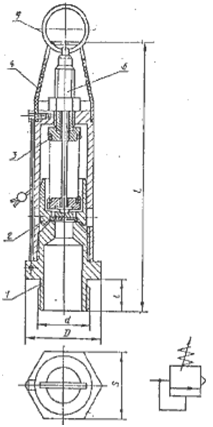 При повышении давления под клапаном сверх давления, определяемого настройкой пружины 6, клапан 2 отходит от седла 1 и открывает свободный выход воздуха. Сила струи поддерживает клапан 2 в поднятом положении до тех пор, пока давление в системе не станет ниже давления настройки, после чего клапан закрывается. Приспособление для принудительного открывания предназначено для проверки исправности клапана продувкой, для чего необходимо потянуть вверх за кольцо 8. Пружина 6 сжимается, и клапан 2 освобождается от ее воздействия. Если клапан не заклинен, то он отходит от седла и открывает выход сжатому воздуху (см.рис.1).