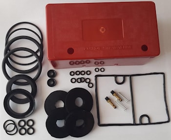 Ремкомплект к четырёхлинейным пневмораспределителям типа В64-1(2)..-03 в основном состоит из деталей, которые в процессе эксплуатации изнашиваются быстрее всего. Ремкомплект позволяет продлить срок службы пневмораспределителя и избежать затрат на покупку нового изделия. При покупке ремкомплекта к пневмораспределителям типа В64-33(34)А следует иметь в виду, что ремкомплект подходит только к распределителям, начиная с 2008 года выпуска. В распределителях, которые были выпущены ранее, кольцо имело иную форму в сечении (фото ремкомплекта В64-33(34)А размещено на данной странице сайта).