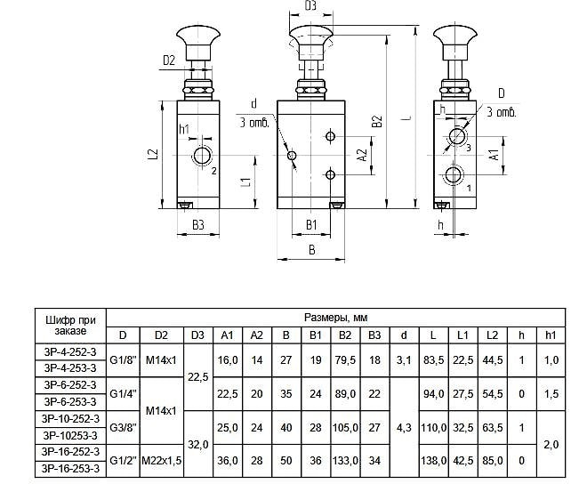 Пневмораспределители типа 3Р-4-252-3; 3Р-4-253-3; 3Р-6-252-3; 3Р-6-253-3; 3Р-10-252-3; 3Р-10-253-3; 3Р-16-252-3; 3Р-16-253-3