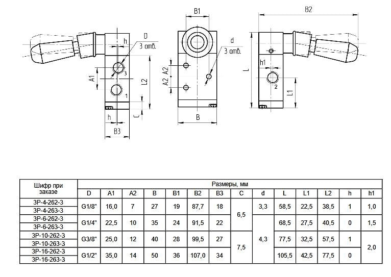 Пневмораспределители 3Р4(6, 10, 16)-253-3 Пневмораспределители 3Р4(6, 10, 16)-262-3