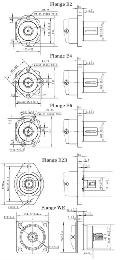 Гидромоторы серии BMSY могут поставляться с различными видами исполнений вала, фланца и резьб портов.