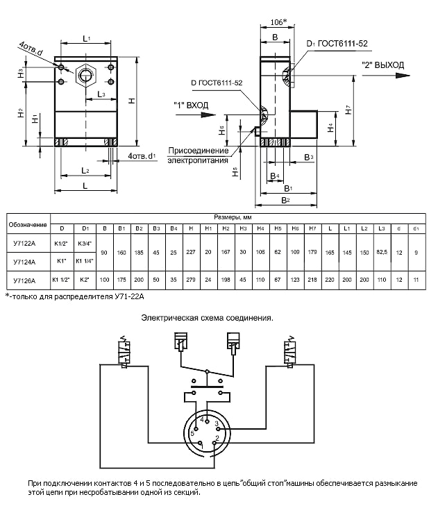 В зависимости от типоразмера (У71-22А, У71-24А, У71-26А) пневмораспределители имеют в корпусе резьбовые отверстия с конической резьбой соответственно «Вход/»Выход»: