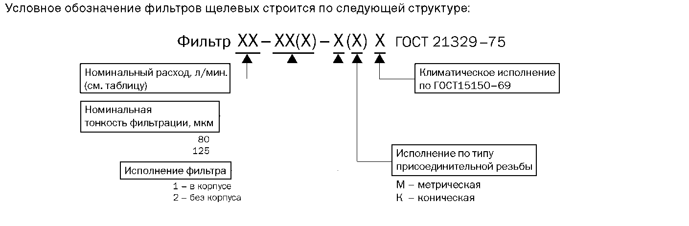 Структура обозначения фильтра щелевого по ГОСТ 21329-75