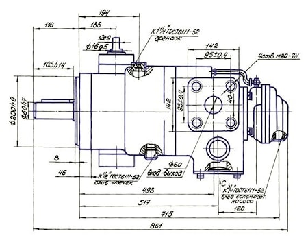 - УНА4-С-125/32 — следящий гидравлический (С-подача на одной полости; СР1-механизм регулирования подачи (реверс));
