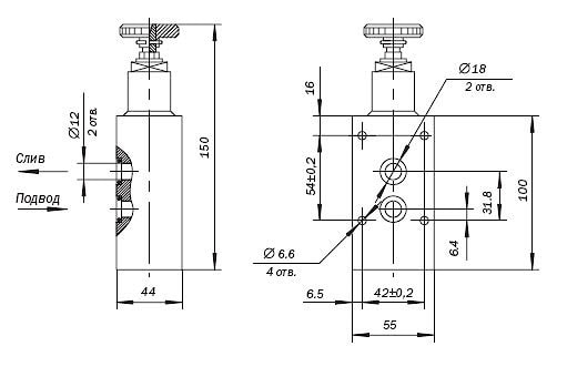 Для предохранения гидравлических систем от перегрузок и для поддержания постоянного давления в системе служат предохранительные клапаны типа СКП. Клапаны предохранительные типа СКП эксплуатируются на чистых минеральных маслах с кинематической вязкостью от 20 до 350 мм2/с (Ст) и t масла от +50С до +500С.Клапаны СКП различаются по виду присоединения: