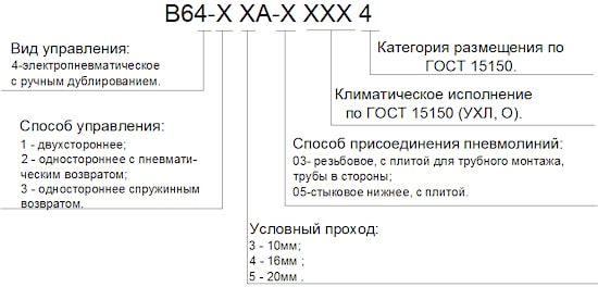 Пример условного обозначения: пневмораспределитель В64-25А-05 УХЛ4; пневмораспределитель В64-14А-03 УХЛ4