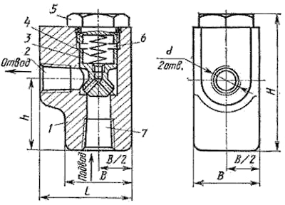 Клапан состоит из корпуса 1, к коническому седлу которого пробкой 5 через пружину 4 прижат плунжер 3. Масло, подводимое в отверстие 7, приподнимает плунжер и проходит в отводное отверстие 2. При изменении направления течения давление масла в отверстии 2 (и полости 6) вместе с пружиной 4 плотно прижимает плунжер к седлу, исключая возможность обратного потока.