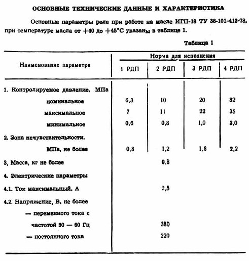 Технические характеристики реле давления типа РДП (РД) (см.табл.1)
